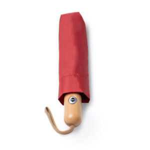 Paraguas plegable de apertura y cierre automático. Tejido RPET pongee 190T antiviento con funda a juego. Mango de bambú y cuerda de algodón.Composición: RPETObservaciones: Presentación en caja diseño eco.