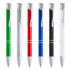 Bolígrafo con cuerpo de aluminio y pulsador en acabado cromado. Carga jumbo de tinta azul.