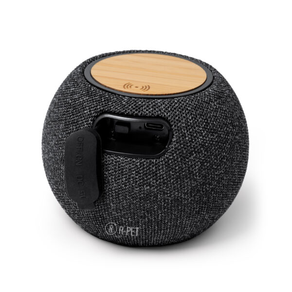 Altavoz inalámbrico redondo fabricado con cuerpo de bambú y poliéster reciclado RPET, con potencia de 5W y conexión Bluetooth. Distancia máxima de funcionamiento de hasta 10 metros y hasta 5 horas de funcionamiento continuo.