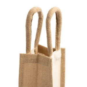 Bolsa de yute laminado y algodón. Asas reforzadas. Ideal para botellas.Composición: Yute y algodón