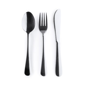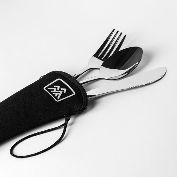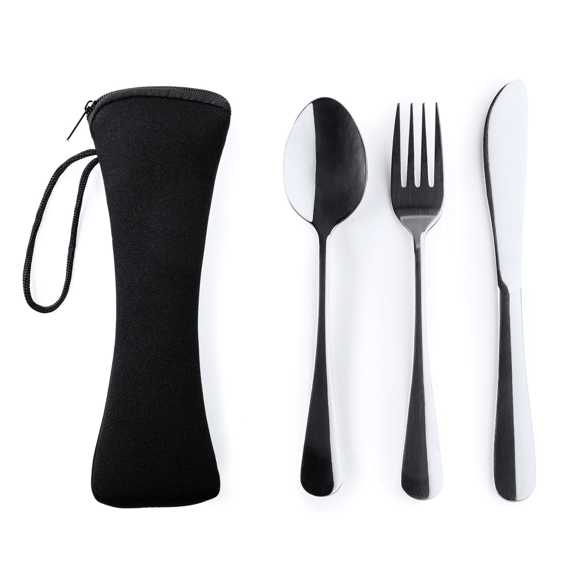 Fantástico set de cubiertos de acero inoxidable presentados en una práctica funda de neopreno. Incluye tenedor, cuchillo y cuchara, perfectos para llevarlos a cualquier parte.
