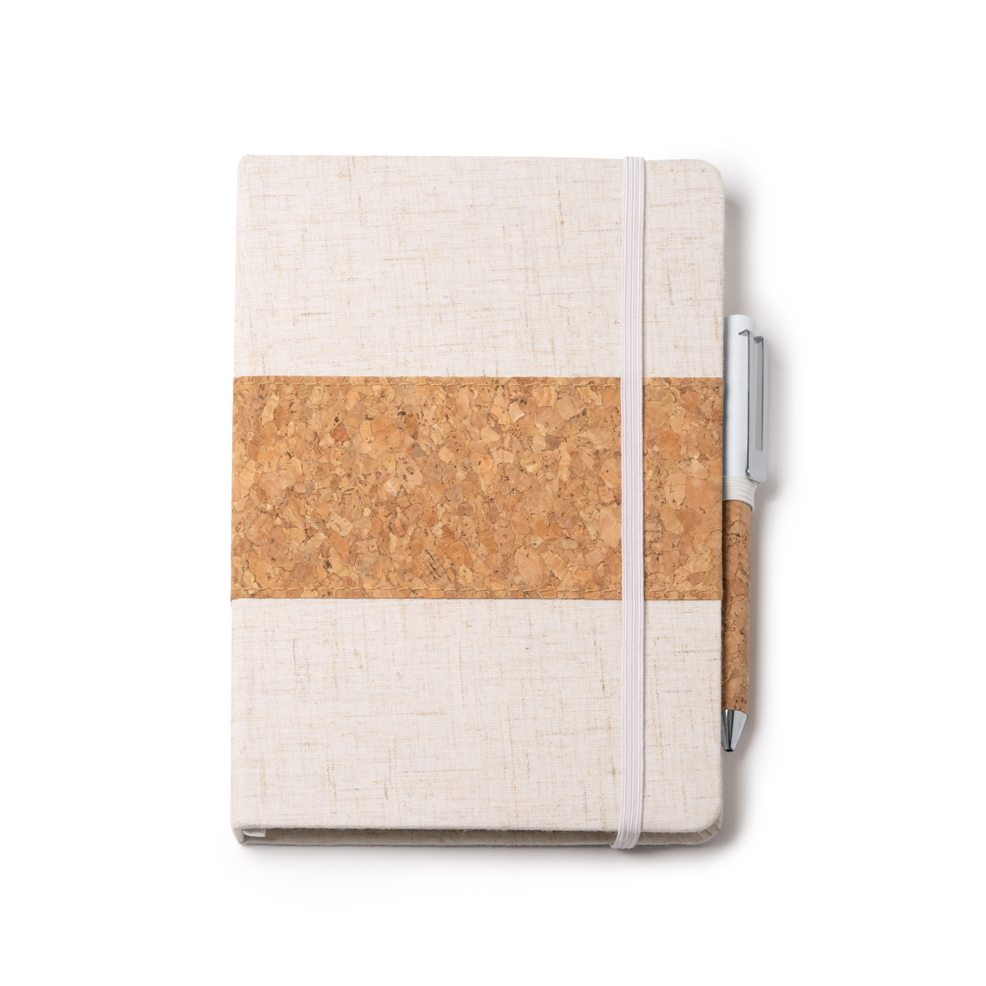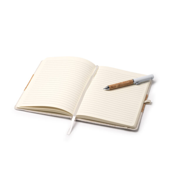 Set libreta A5 y bolígrafo presentados en un estuche de cartón kraft. Libreta con tapa rígida de algodón y corcho con 80 hojas rayadas. Bolígrafo metálico con empuñadura de corcho. Tinta azul.