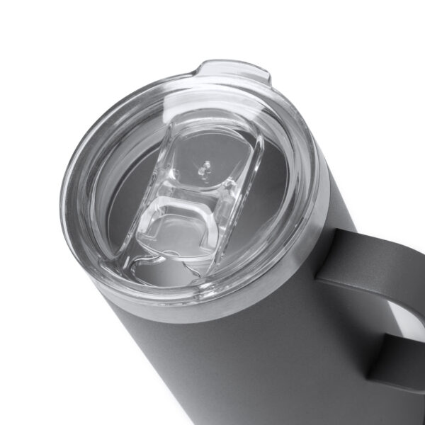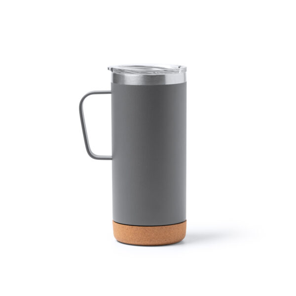 Taza de acero inoxidable reciclado de doble pared. Con base de corcho, evitando deslizamientos en su uso. Además cuenta con tapa dosificadora de seguridad transparente, con cierre a rosca con refuerzo de silicona para mejorar su hermeticidad. Con capacidad de 600ml.