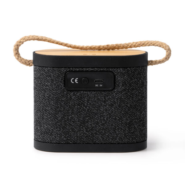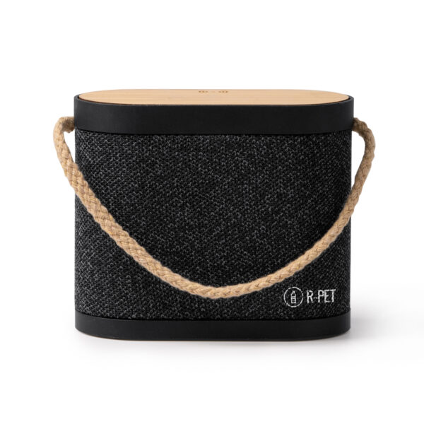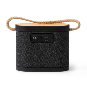 Altavoz inalámbrico con cuerpo de bambú, poliéster reciclado RPET y asa de transporte en algodón, con 5W de potencia y conexión Bluetooth. Distancia máxima de funcionamiento de hasta 10 metros y tiempo de funcionamiento continuo de hasta 5 horas. Recargable con cable Tipo C, incluido. Con función de carga inalámbrica en la superficie de bambú, con 15W de potencia para recarga de dispositivos provistos de esta tecnología. Con indicador luminoso de carga.