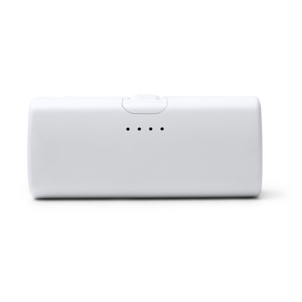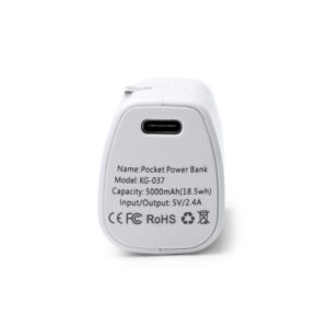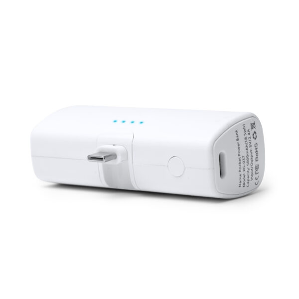 Batería externa de 5000 mAh realizada en ABS reciclado. Cuenta con función linterna en uno de los extremos y cable tipo C extensible incorporado. Puerto Tipo C de entrada y salida. Con indicador luminoso de porcentaje de batería y protector externo anticaídas