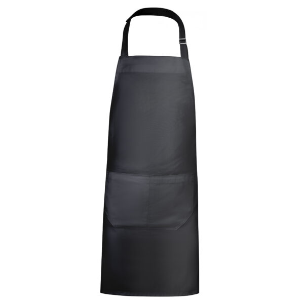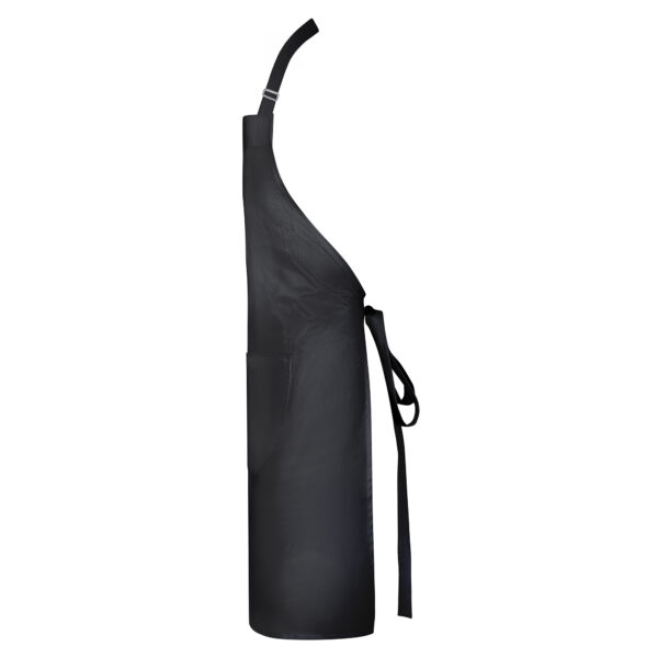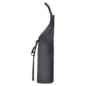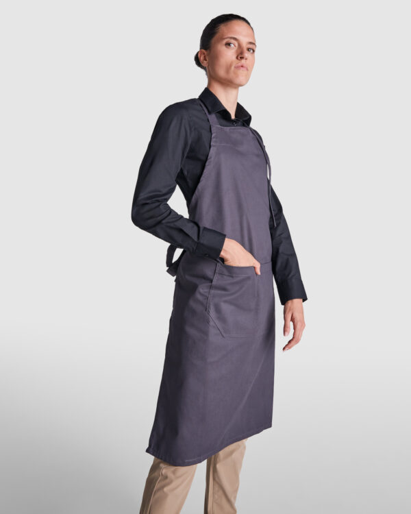 Delantal largo de sarga en poliéster reciclado y algodón reciclado. Tirante con cierre ajustador. Cintas laterales para lazada. Dos bolsillos frontales.