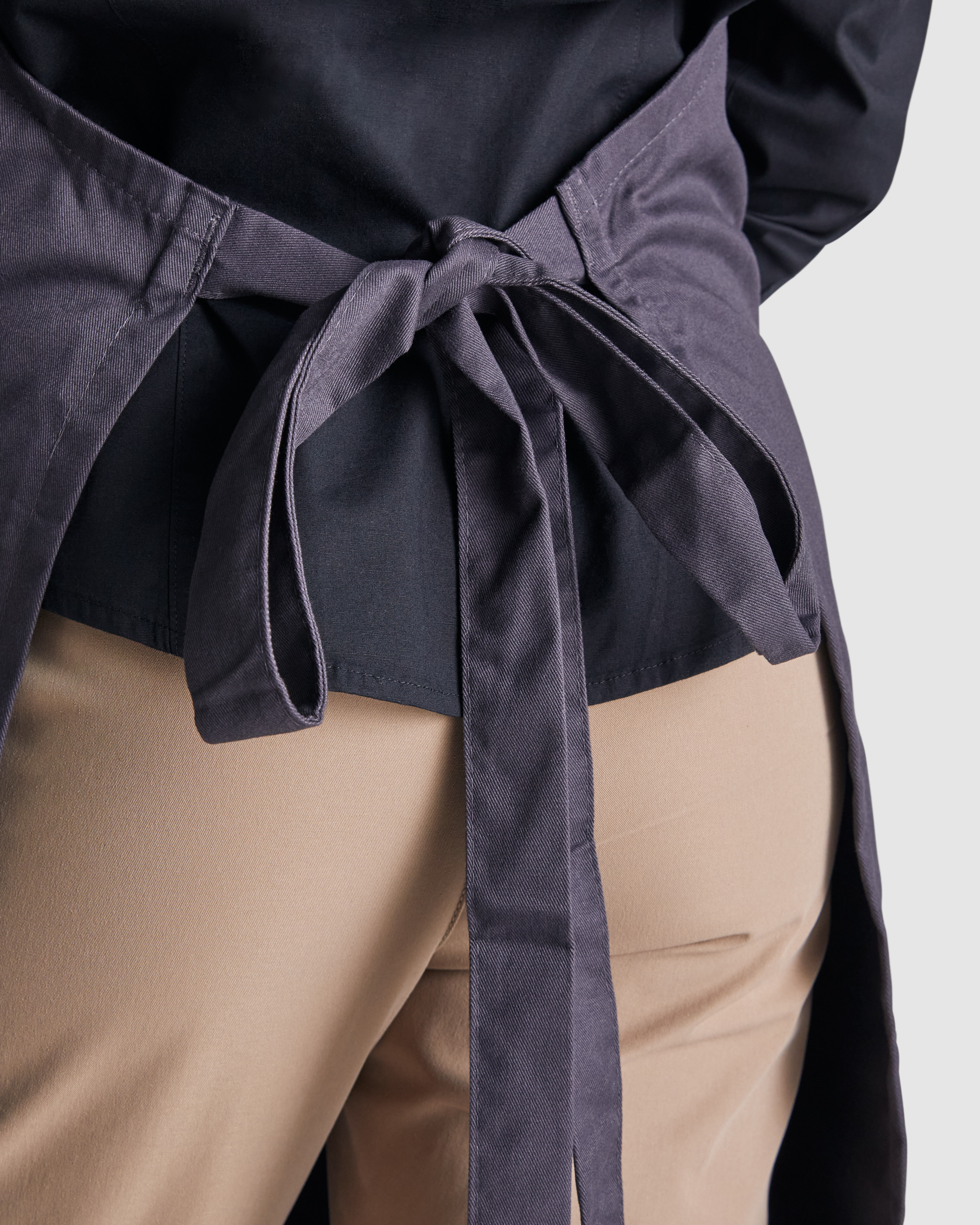 Delantal largo de sarga en poliéster reciclado y algodón reciclado. Tirante con cierre ajustador. Cintas laterales para lazada. Dos bolsillos frontales.