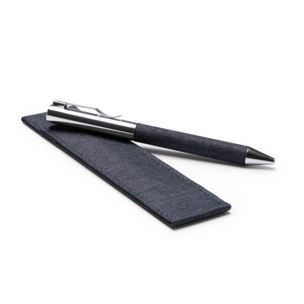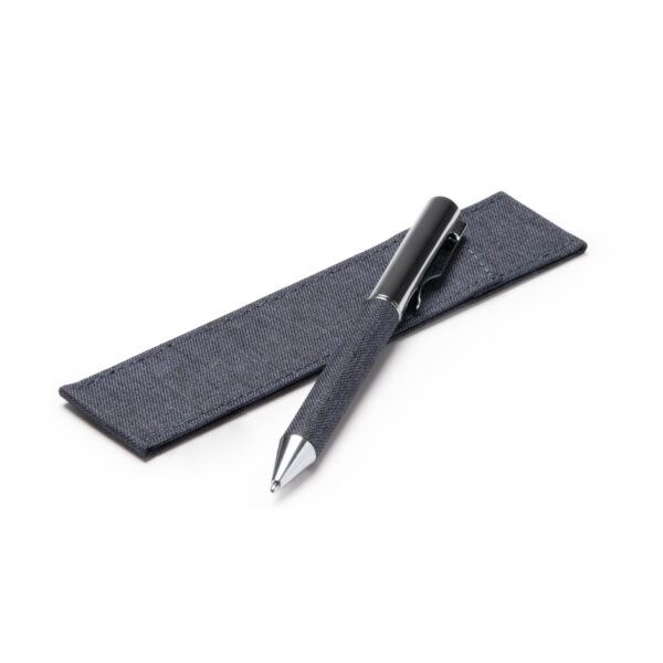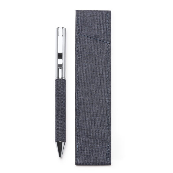 Bolígrafo giratorio realizado en metal y políester reciclado RPET. Tinta azul. Presentado en funda de poliéster reciclado RPET a juego.Composición: Poliéster reciclado RPET