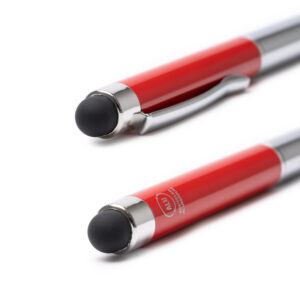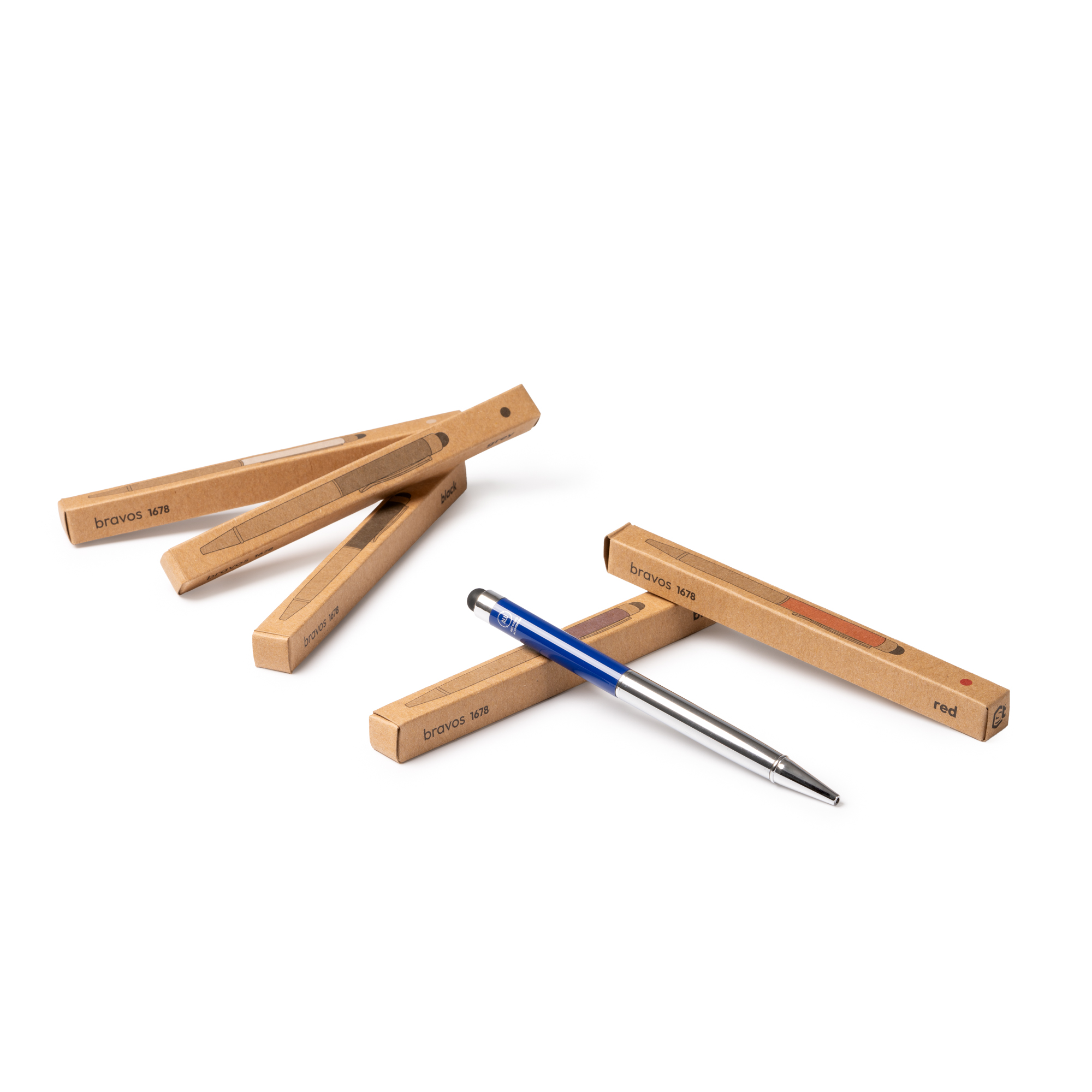 Bolígrafo giratorio con cuerpo de aluminio reciclado y puntero táctil. Acabado en metal cromado y detalle en color. Carga jumbo metálica de tinta azul.Composición: Aluminio recicladoObservaciones: Presentación en caja diseño kraft.