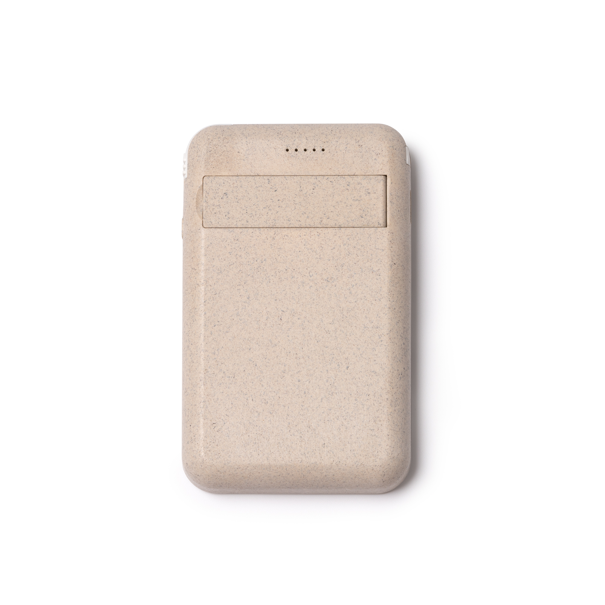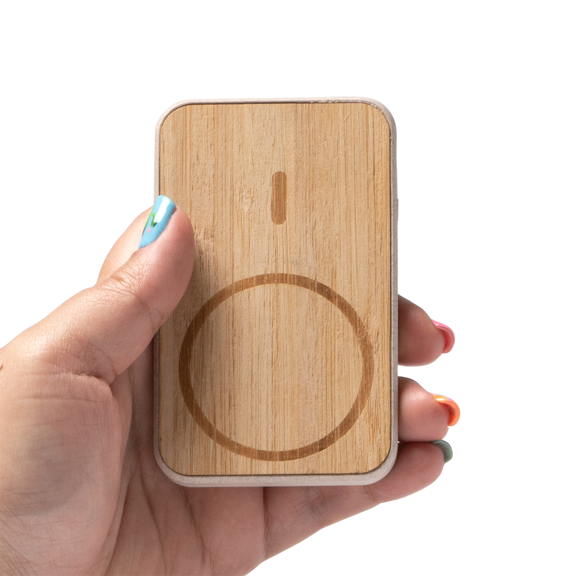Batería externa de 5000 mAh con cuerpo de bambú y fibra de trigo. Con cargador magnético en la superficie para carga inalámbrica de dispositivos provistos de esta tecnología. Cuenta con soporte para smartphone en la parte trasera y cable tipo C integrado. Con indicador luminoso. Incluye cable Tipo C.
