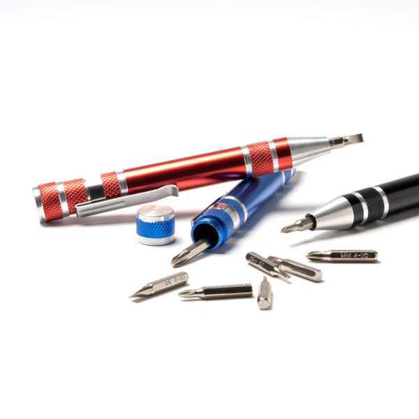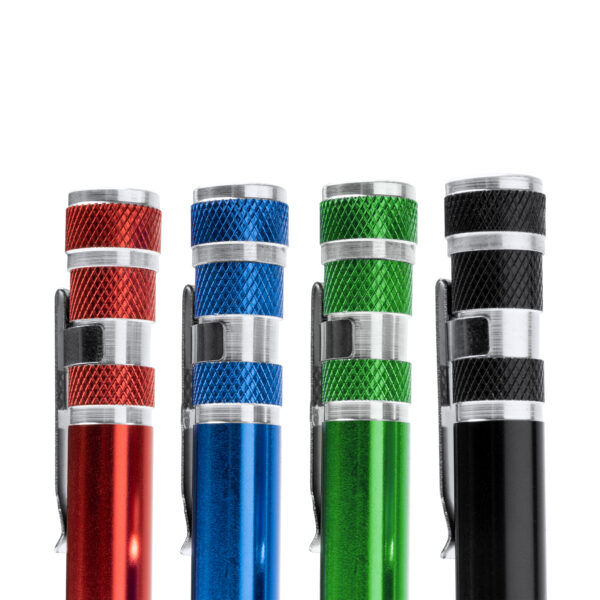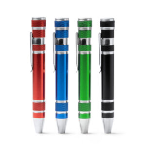Multiherramienta de aluminio en forma de bolígrafo. Incluye 8 cabezales de destornillador, estrella y planos.Composición: Aluminio