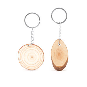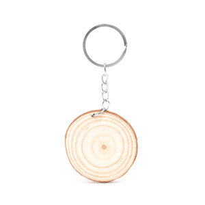 Llavero de corte de madera natural con anilla metálica.