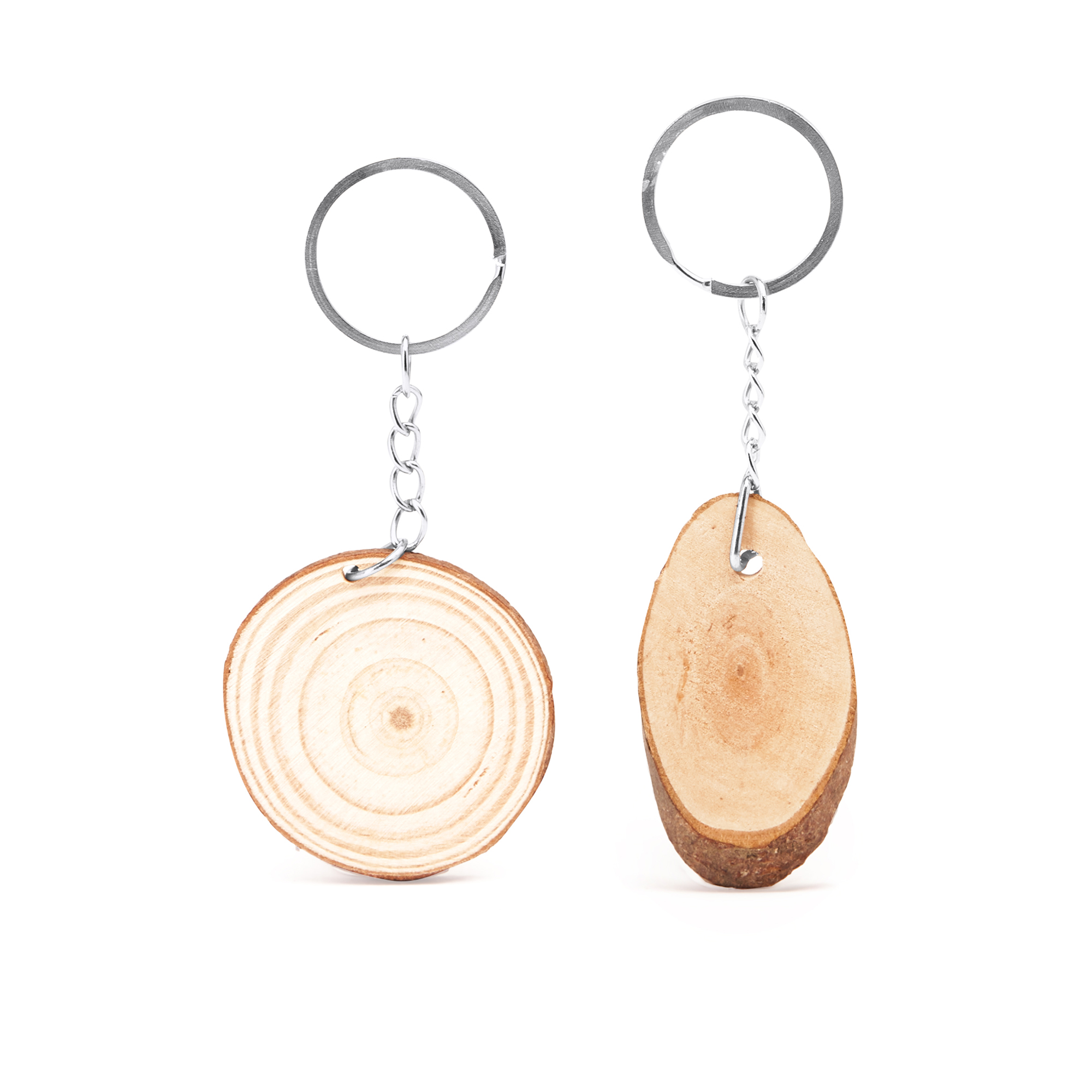 Llavero de corte de madera natural con anilla metálica.