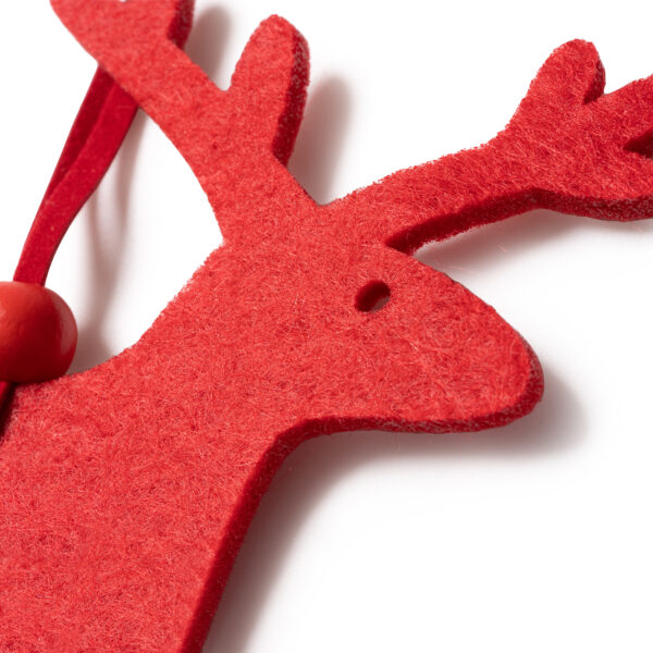 Set de adornos navideños de fieltro, en el que se incluyen tres diseños: estrella, árbol y reno. Las tres figuras se presentan con un cordel rojo y una cuenta del mismo color en su extremo.