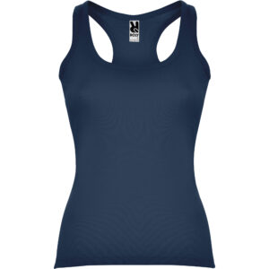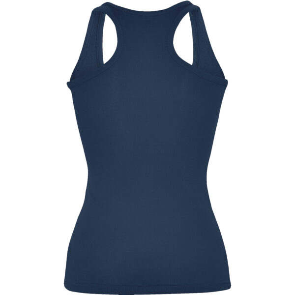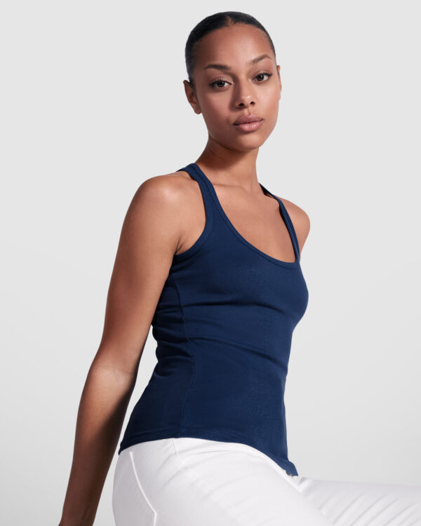 Camiseta de tirantes en punto de canalé entallada en cintura. Espalda nadadora. Cuello con amplio escote redondo y sisas con ribete del mismo tejido.