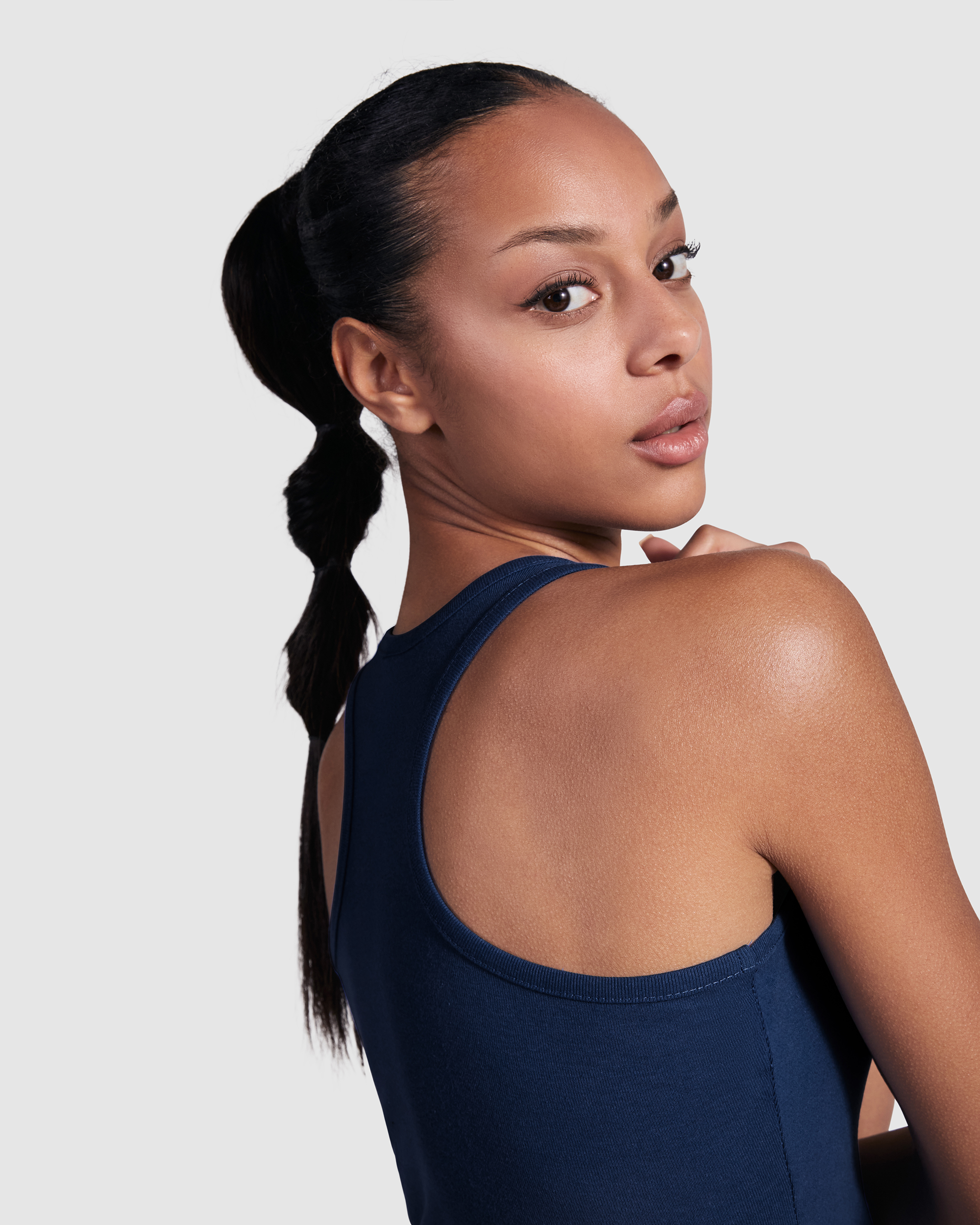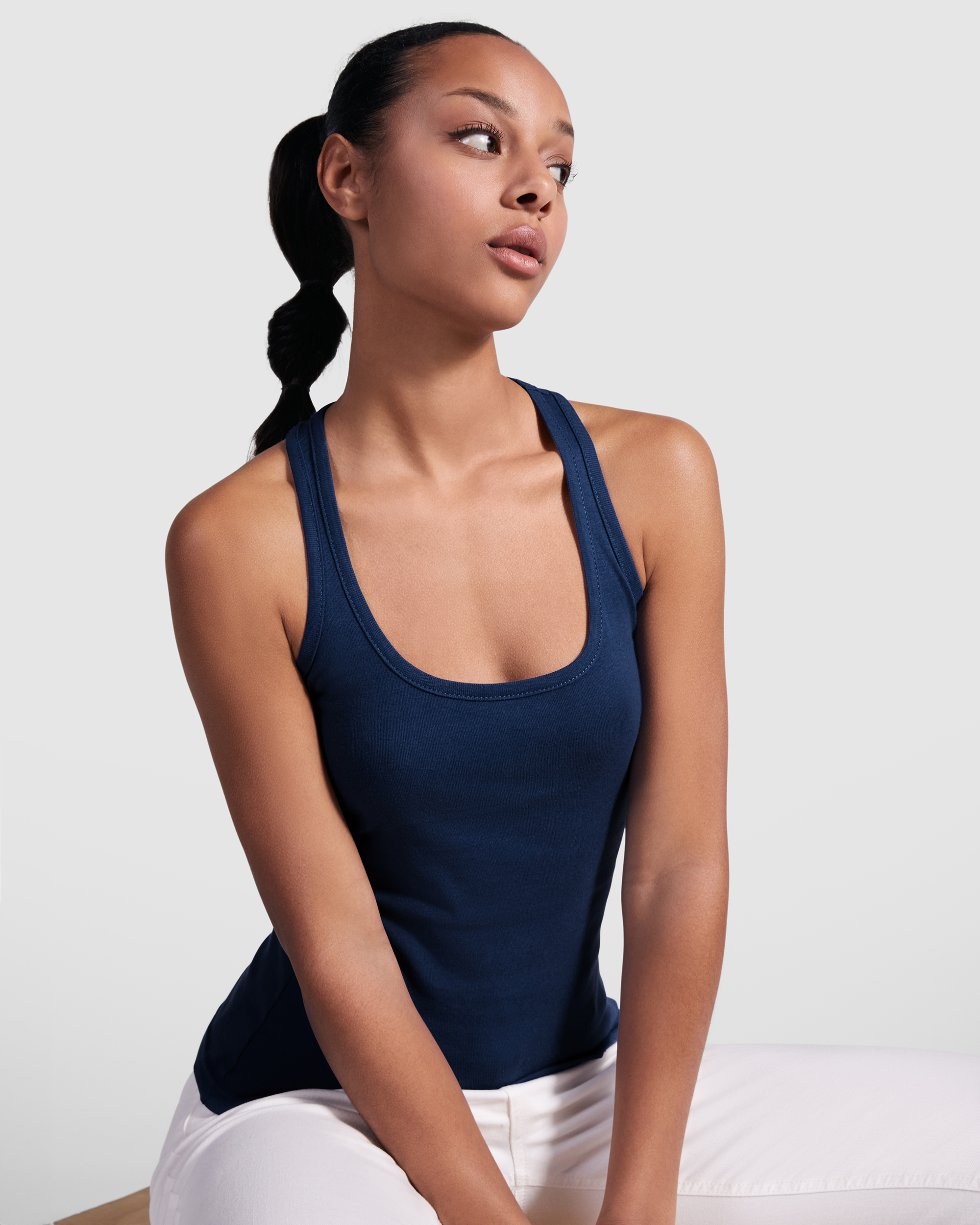 Camiseta de tirantes en punto de canalé entallada en cintura. Espalda nadadora. Cuello con amplio escote redondo y sisas con ribete del mismo tejido.