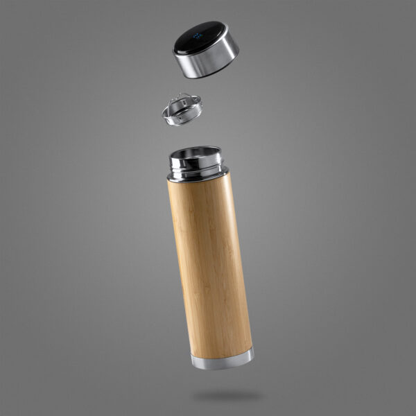 Termo doble pared de acero inoxidable 304 y bambú con infusor. Incluye termómetro digital táctil en la tapa para saber la temperatura de tu bebida, ideal para saber si tu bebida está caliente o fría. Capacidad de 480 ml.