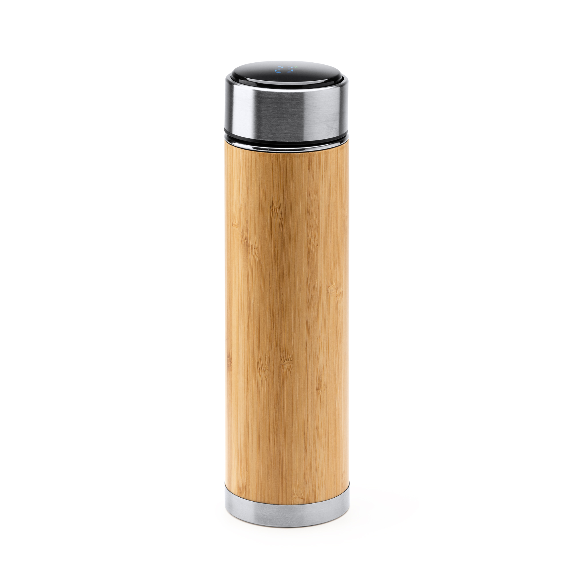 Termo doble pared de acero inoxidable 304 y bambú con infusor. Incluye termómetro digital táctil en la tapa para saber la temperatura de tu bebida, ideal para saber si tu bebida está caliente o fría. Capacidad de 480 ml.