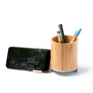 Lapicero multifunción con cuerpo elaborado en bambú y base con función de cargador inalámbrico realizado en fibra de trigo. La base de carga es extraíble del lapicero mediante un punto de anclaje deslizándola lateralmente. Potencia de cargador inalámbrico de 15W. Incluye soporte para Smartphone en la base de carga e indicador luminoso de confirmación de carga. Incluye dos puertos de salida USB y dos puertos Tipo C de entrada y salida. Compatible con dispositivos móviles provistos de tecnología de este tipo de carga.