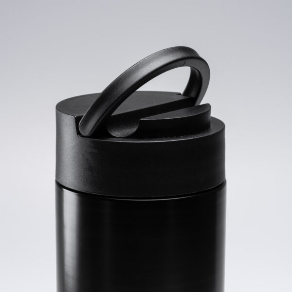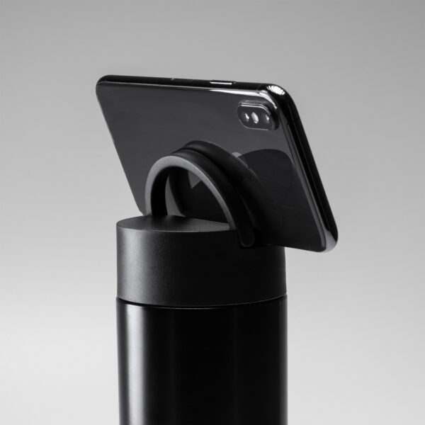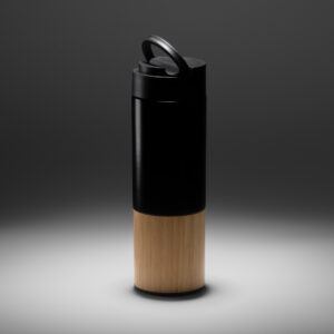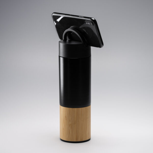 Bidón térmico de acero inoxidable 304 doble pared con detalle en bambú. Idóneo bidón para mantener las bebidas frías y calientes. Tapa con asa función soporte, ideal para smartphone. Capacidad 450 ml.