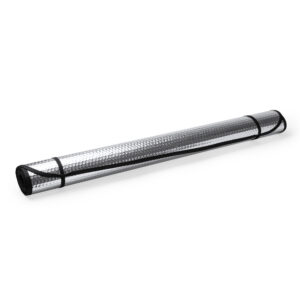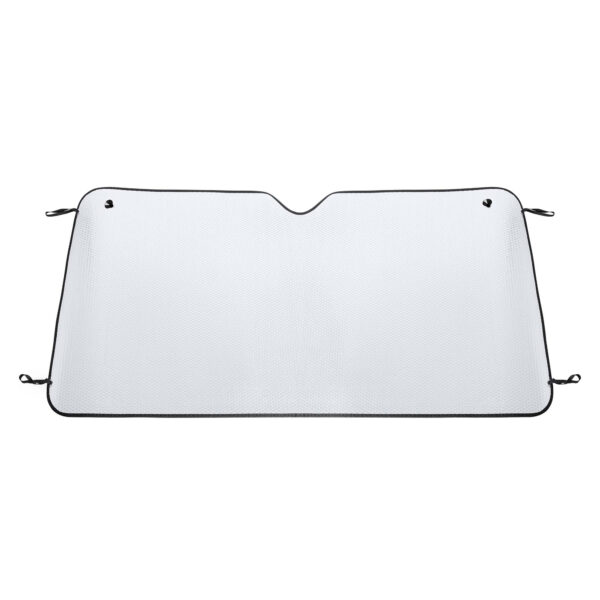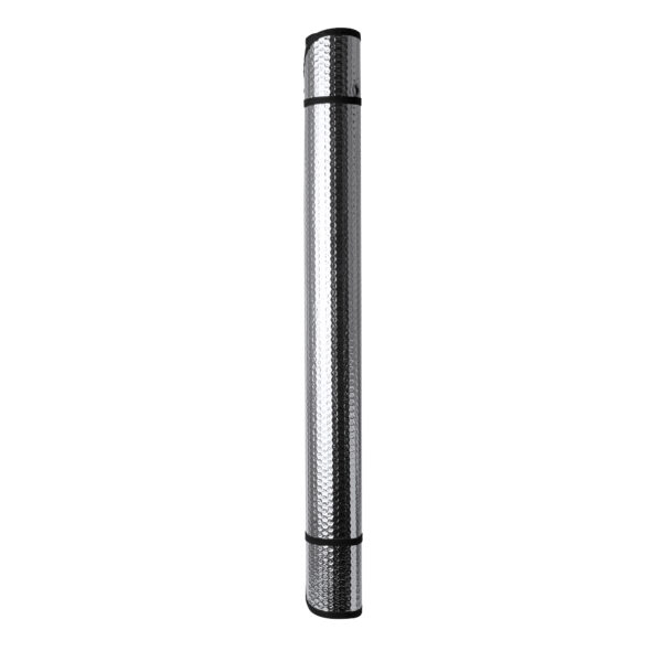 Parasol de grandes dimensiones ideal para camiones y furgonetas. Burbuja a doble cara, realizado en aluminio acabado metalizado y ribete en negro. Incluye argollas metálicas con ventosas y cintas elásticas para plegado.