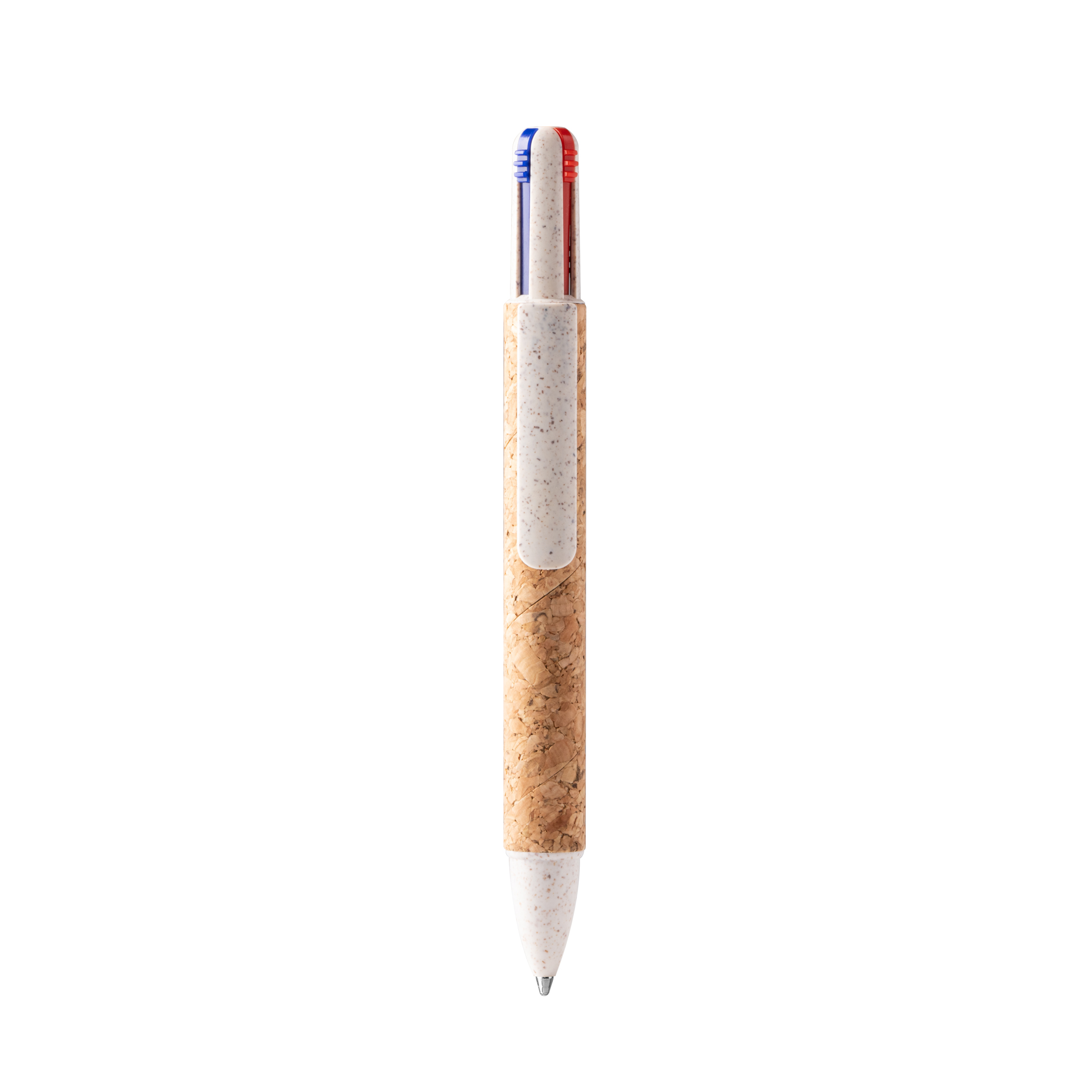 Bolígrafo de 4 tintas con pulsador retráctil. Cuerpo de corcho y fibra de trigo. Tinta azul, rojo, verde y negro. Composición: Corcho y fibra de trigo