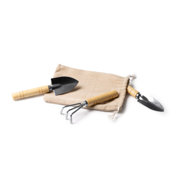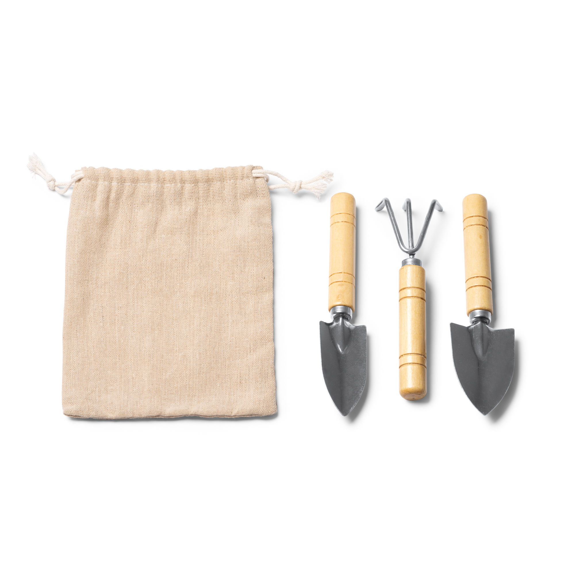 Set de jardinería con 3 accesorios realizados en acero inoxidable y mango en bambú. Incluye pala trasplantadora grande, pala trasplantadora pequeña y rastrillo. Incluye funda de algodón.