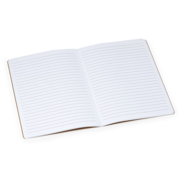 Libreta A5 con tapas elaboradas en cartón reciclado y 60 hojas de rayas. Cuenta con un original acabado cosido en su lomo, dotándola de un acabado totalmente ecológico.