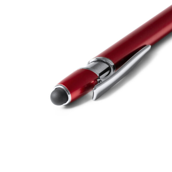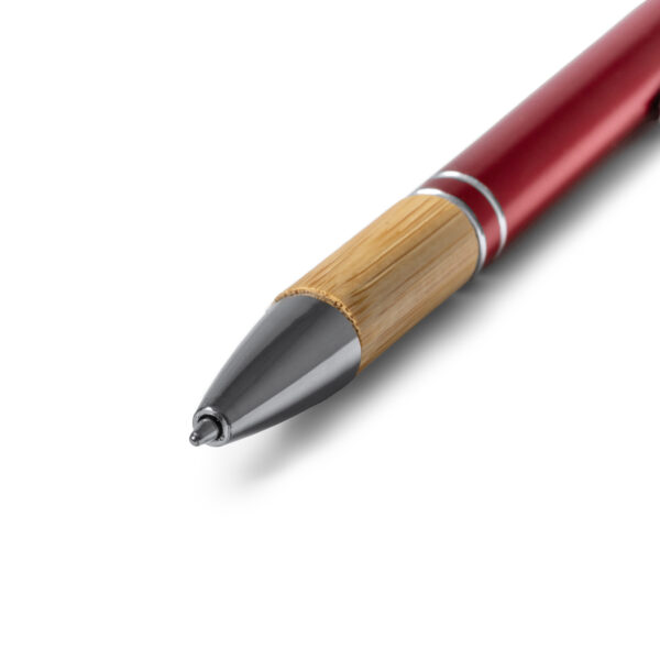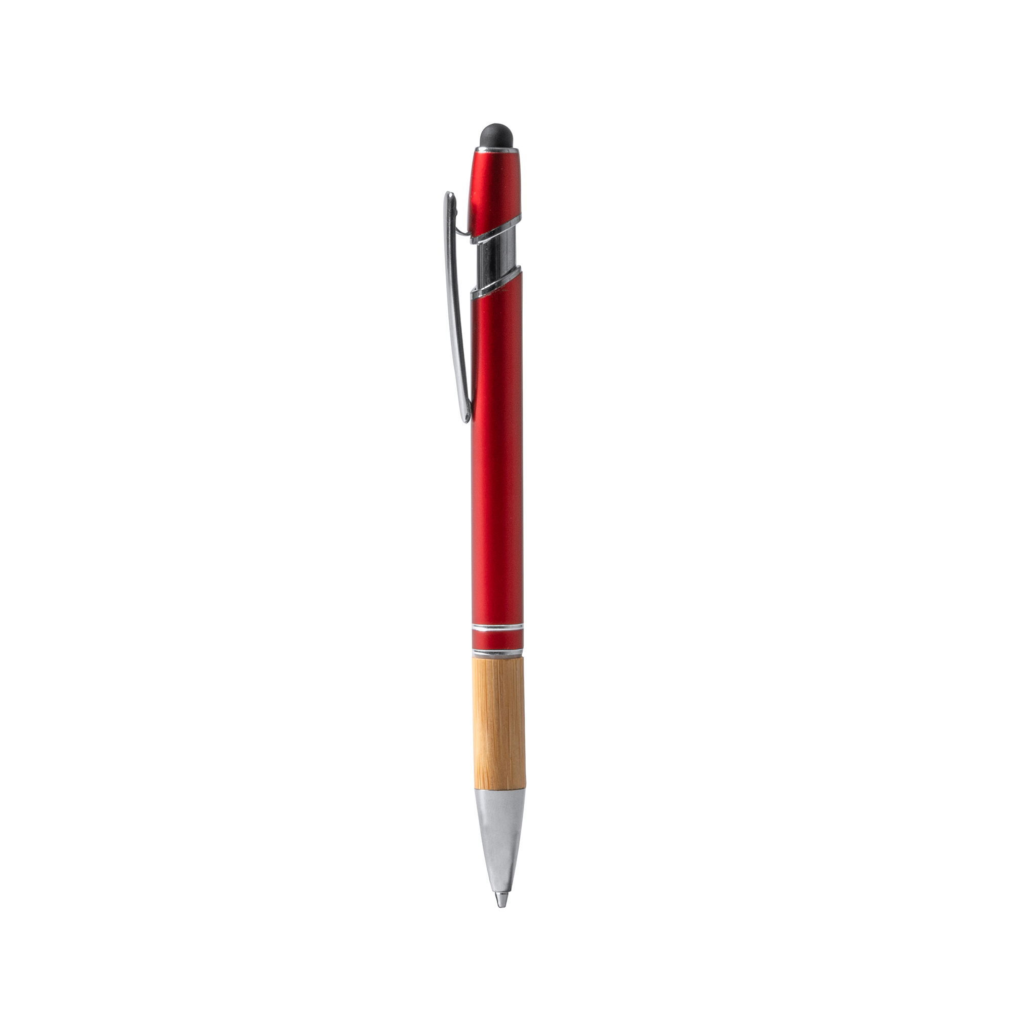 El bolígrafo de metal con empuñadura de bambú y detalles cromados. Cuenta con puntero táctil para interactuar con dispositivos de pantalla táctil, como smartphone o tablets. Tinta azul. Composición: Bambú