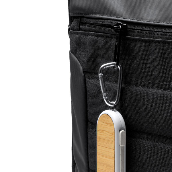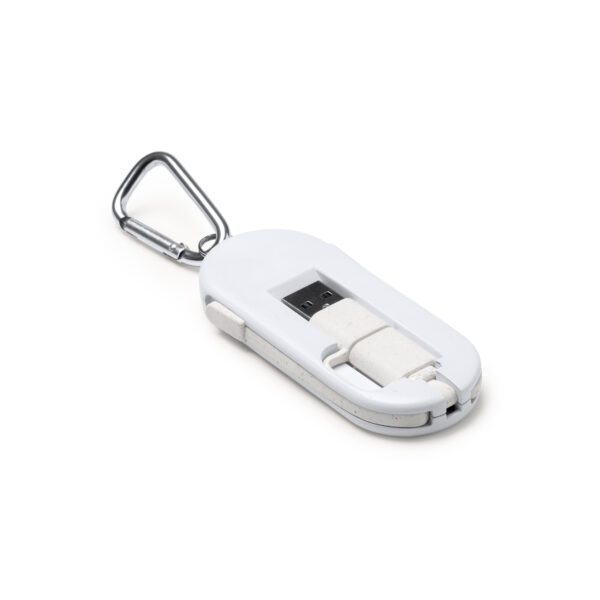 Cable cargador 4 en 1, con cuerpo fabricado en fibra de trigo y superficie en bambú. Cables también en fibra de trigo. Cuenta con múltiples conexiones: entrada USB y Tipo C, y salidas Micro USB, Tipo C y Lightning. Aspecto compacto gracias a las ranuras de guardado de los cables. Con mosquetón incorporado.