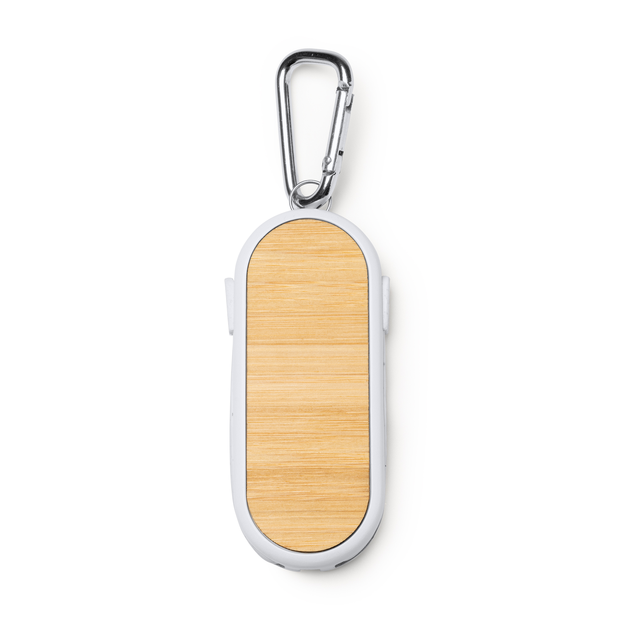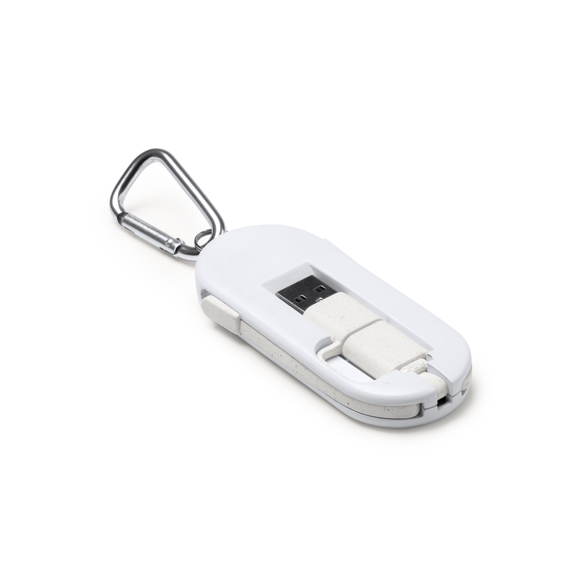 Cable cargador 4 en 1, con cuerpo fabricado en fibra de trigo y superficie en bambú. Cables también en fibra de trigo. Cuenta con múltiples conexiones: entrada USB y Tipo C, y salidas Micro USB, Tipo C y Lightning. Aspecto compacto gracias a las ranuras de guardado de los cables. Con mosquetón incorporado.
