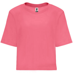 Camiseta manga corta con talle corto y holgado. Cuello redondo en canalé 1×1 ancho. Cubrecosturas en cuello del mismo tejido.