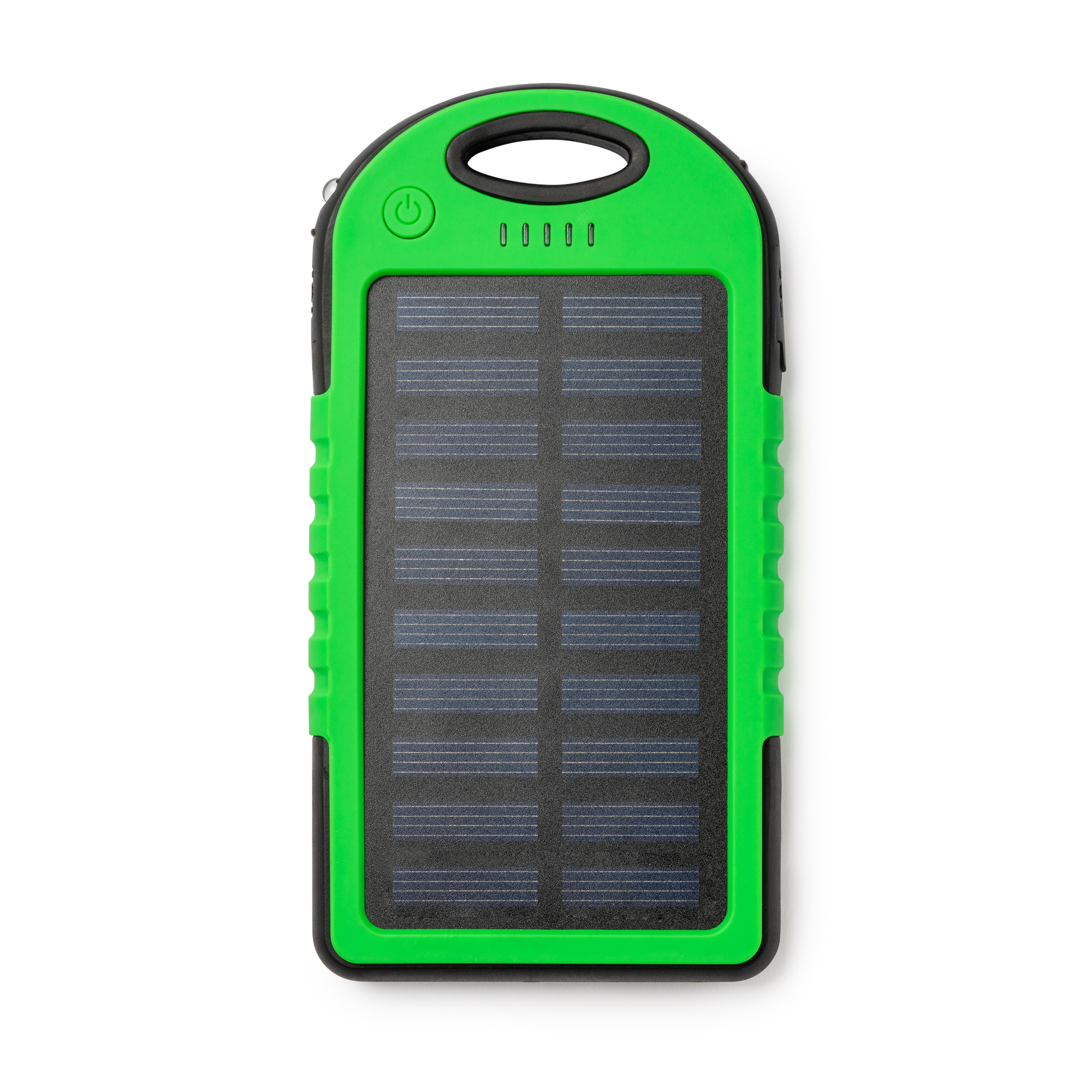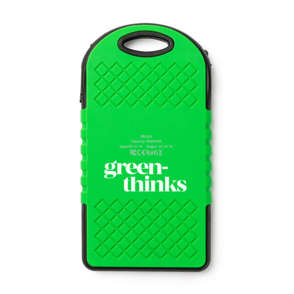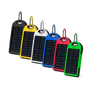 Batería externa con capacidad de 4000mAh. Elaborado en materiales repelentes de líquidos. Cuenta con panel solar de recarga y carga eléctrica mediante cable. Indicador de carga luminoso y función linterna en el lateral. Incluye mosquetón de color a conjunto. Con dos ranuras de salida USB y cable Tipo C incluido.