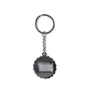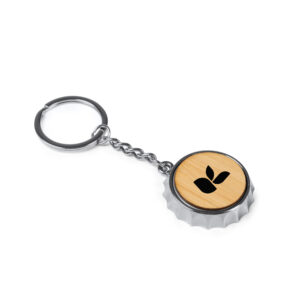 Llavero abridor diseño de chapa. Acabado cromado y superficie de bambú.