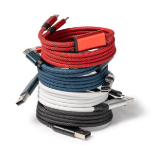 Cable antienredo con salida USB, Tipo C y Lightning. Conexión de entrada Tipo C y adaptador USB. Cable imantado a lo largo de su longitud.