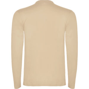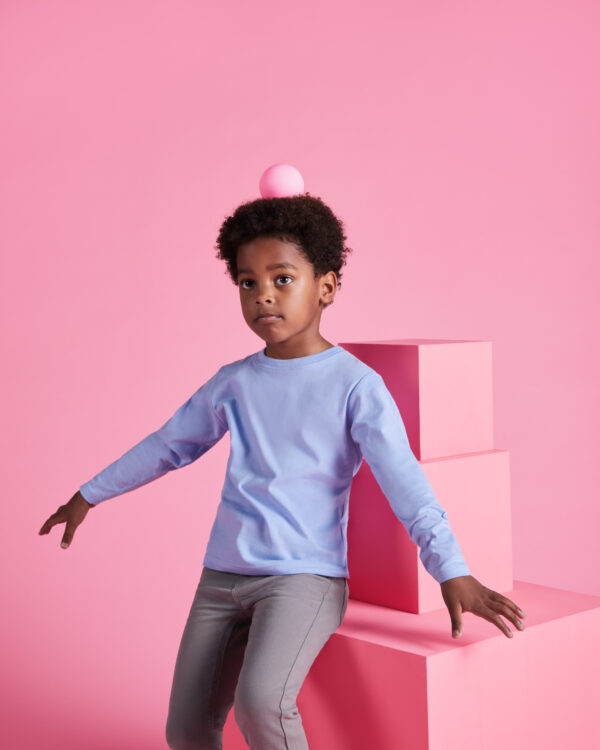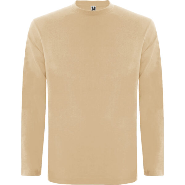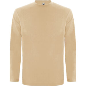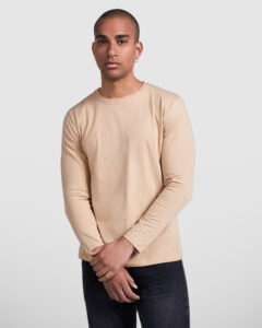 Camiseta de manga larga tubular en tallas de adulto y costuras laterales en tallas de niño. Cuello redondo en canalé 1×1 (4 capas). Cubrecosturas en cuello del mismo tejido.