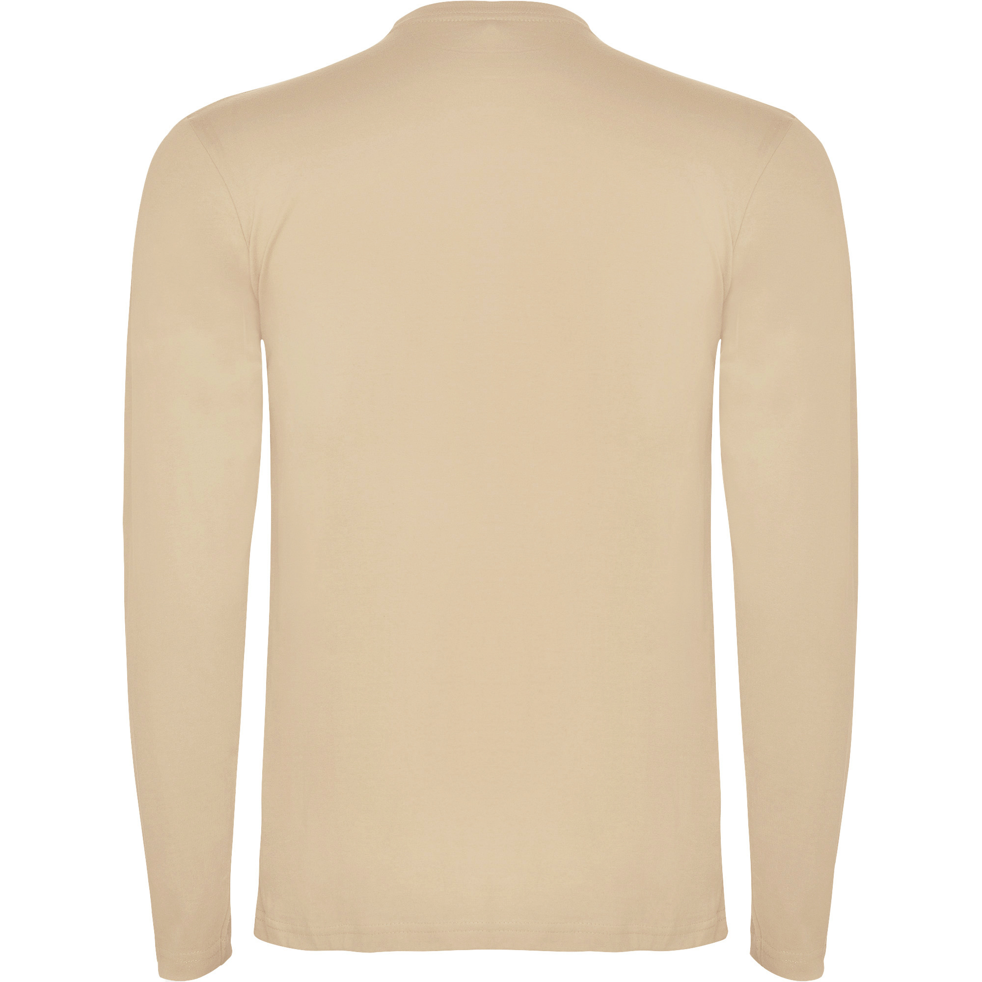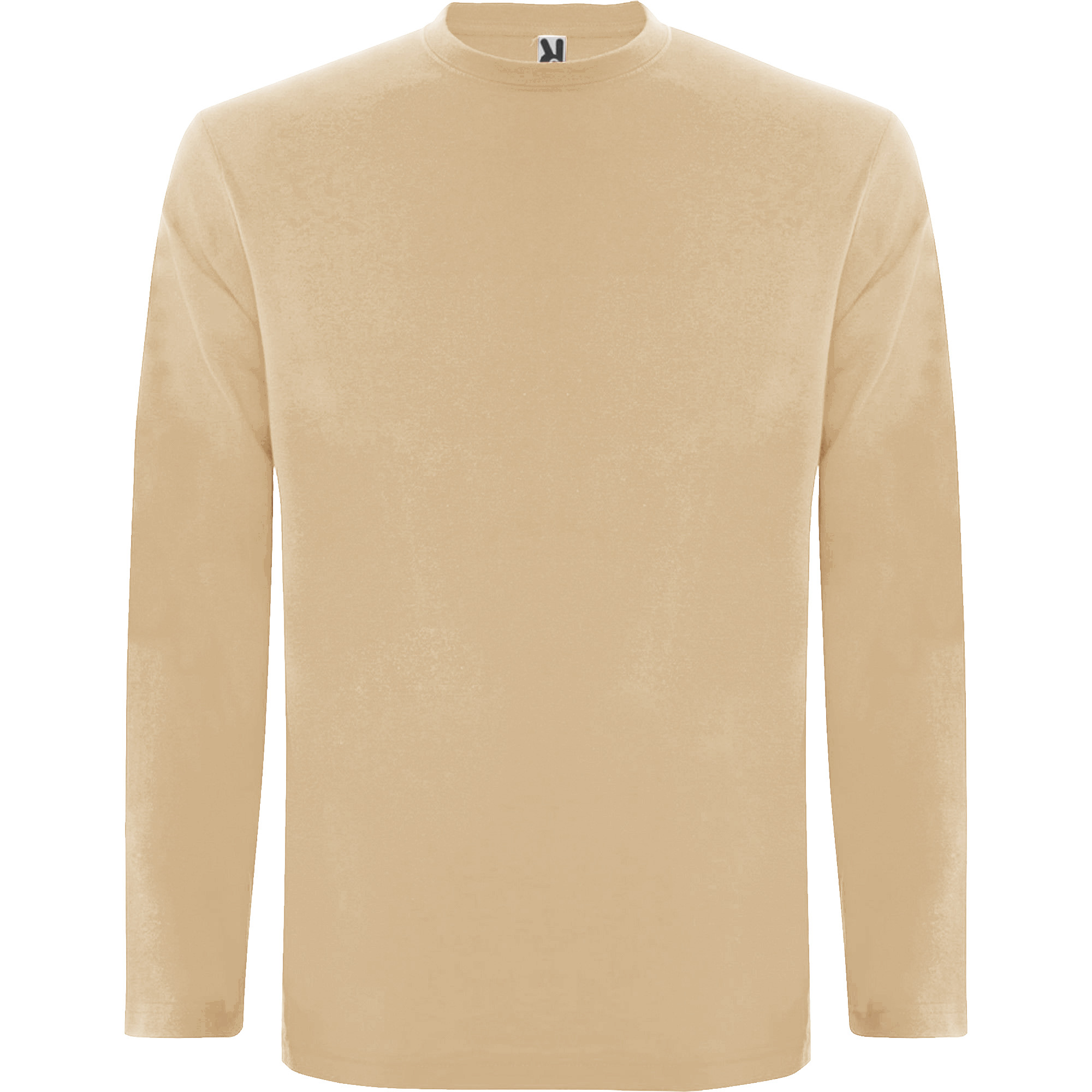 Camiseta de manga larga tubular en tallas de adulto y costuras laterales en tallas de niño. Cuello redondo en canalé 1×1 (4 capas). Cubrecosturas en cuello del mismo tejido.