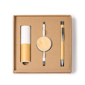 Batería realizada en bambú y ABS reciclado, de 4.500mAh, con entrada USB y salida Tipo C, con indicador luminoso. Cable extensible en bambú y ABS reciclado con adaptador Tipo C y USB. Bolígrafo elaborado en bambú, de tinta azul. Presentación en caja diseño eco.