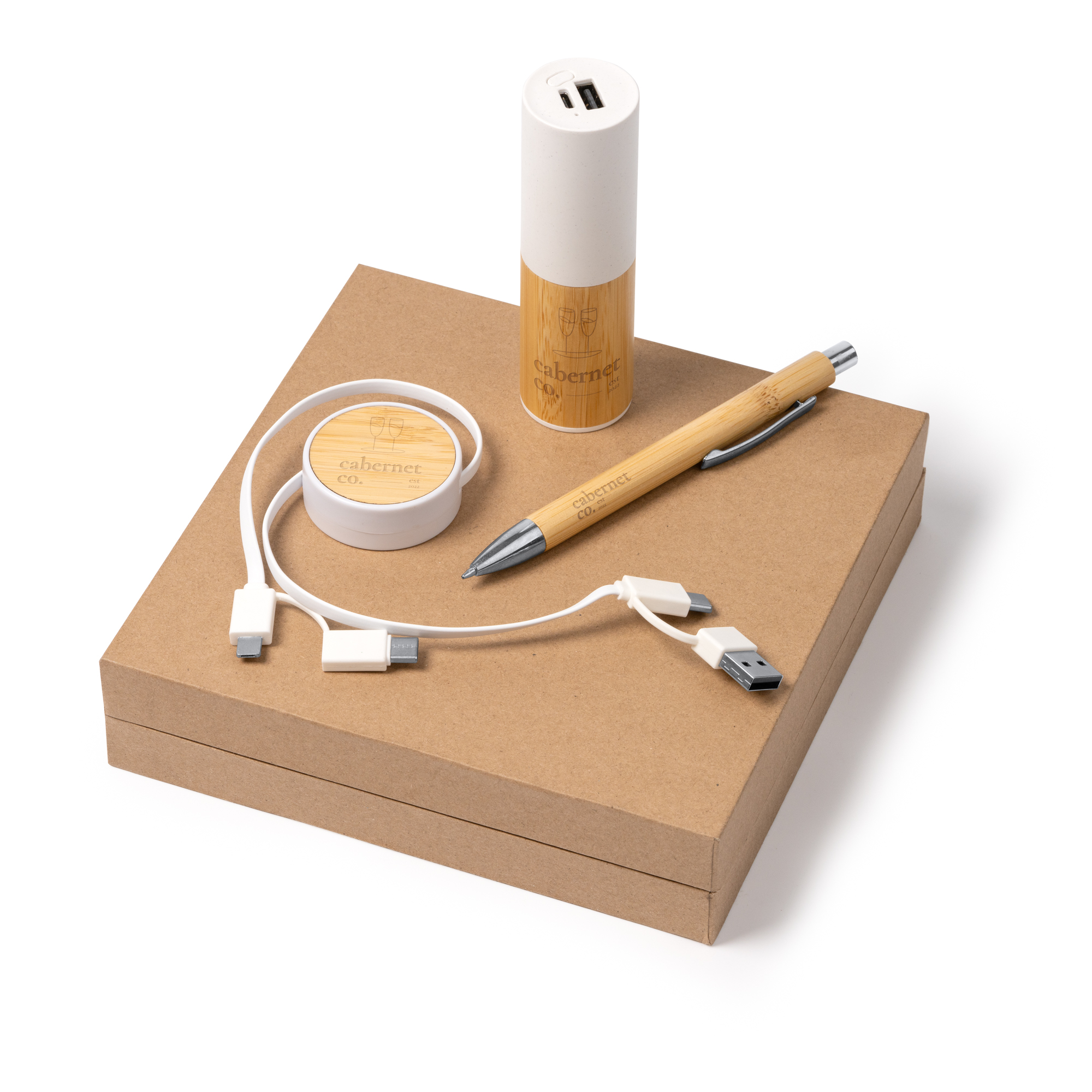 Batería realizada en bambú y ABS reciclado, de 4.500mAh, con entrada USB y salida Tipo C, con indicador luminoso. Cable extensible en bambú y ABS reciclado con adaptador Tipo C y USB. Bolígrafo elaborado en bambú, de tinta azul. Presentación en caja diseño eco.