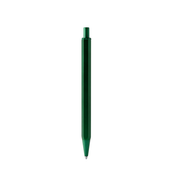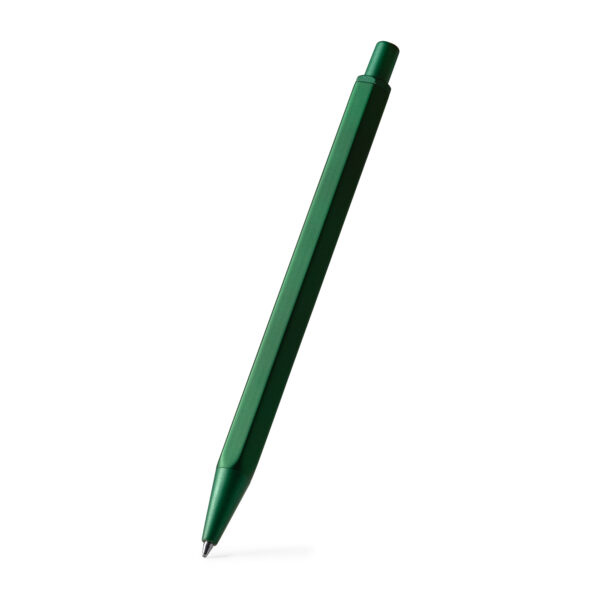 Bolígrafo hexagonal con cuerpo metálico, ofrece un diseño elegante, original y ergonómico. La carga jumbo de tinta azul garantiza una escritura fluida y duradera.