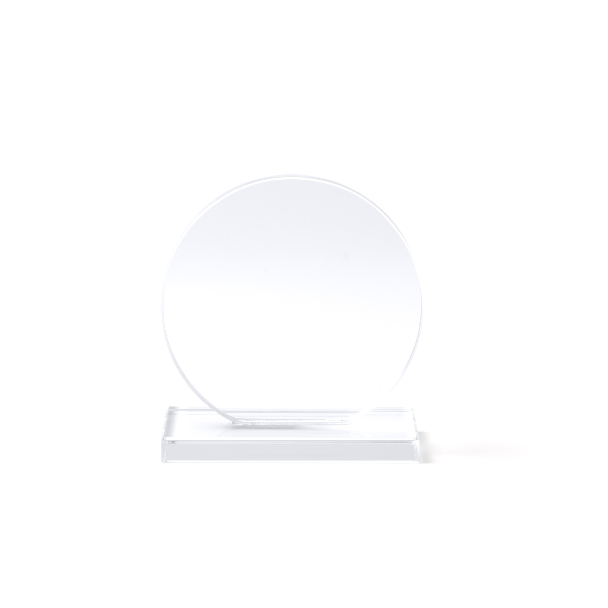 Trofeo de cristal de diseño circular con base rectangular. Incluye estuche de presentación con base acolchada en color negro. Composición: CristalObservaciones: