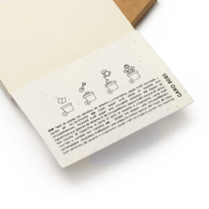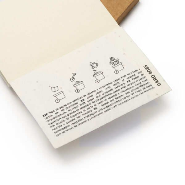 Bloc de notas con cubiertas de papel reciclado y degradable con semillas. Incluye 50 hojas de papel reciclado. Composición: Papel reciclado.Observaciones: No enviamos este artículo a las islas.