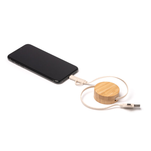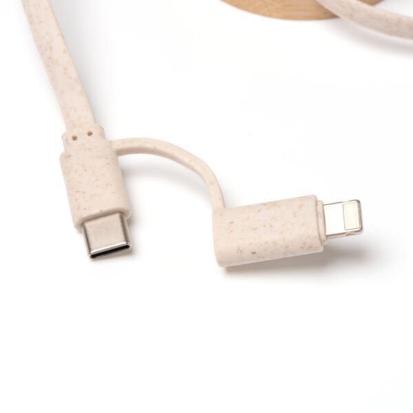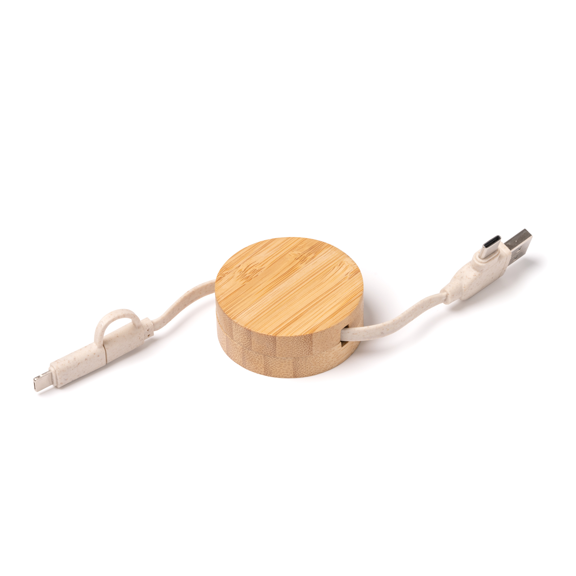 Cable cargador extensible con cuerpo elaborado en bambú y cable en fibra de trigo.