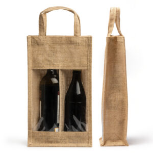 Bolsa de yute laminado con ventana y doble compartimento. Ideal para transportar botellas. Asas reforzadas.Composición: Yute
