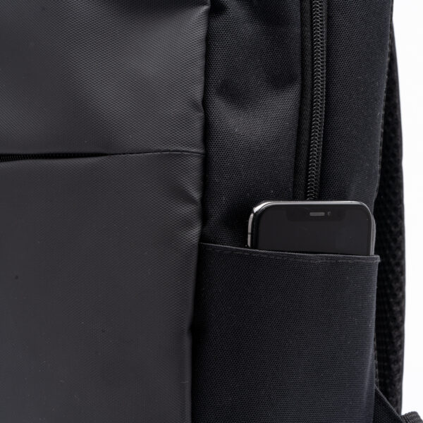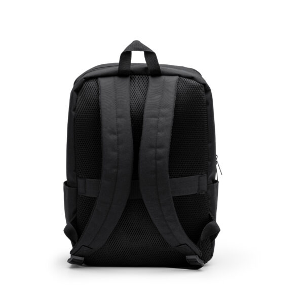 Mochila elaborada en PU Leather y políester reciclado RPET 600D con espalada y asas de hombro acolchadas generan un diseño ergonómico. Cuenta con un compartimento principal con bolsillo acolchado optimizado para transporte de ordenador portátil y dispositivos de hasta 15″. Cuenta con bolsillo frontal y cinta posterior para trolley.