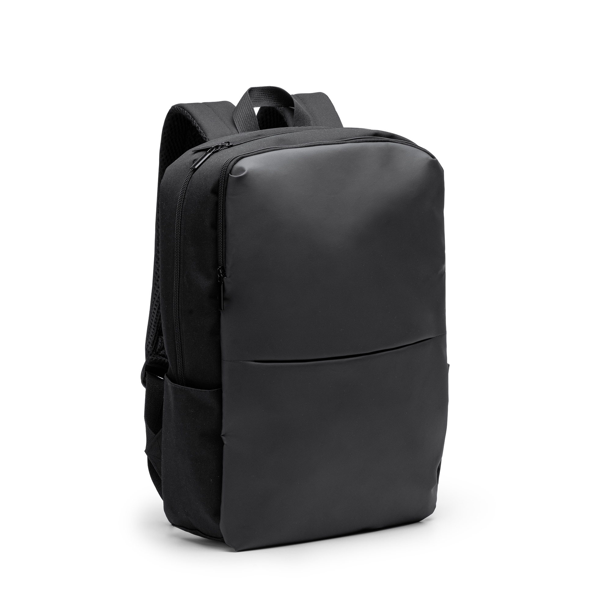 Mochila elaborada en PU Leather y políester reciclado RPET 600D con espalada y asas de hombro acolchadas generan un diseño ergonómico. Cuenta con un compartimento principal con bolsillo acolchado optimizado para transporte de ordenador portátil y dispositivos de hasta 15″. Cuenta con bolsillo frontal y cinta posterior para trolley.