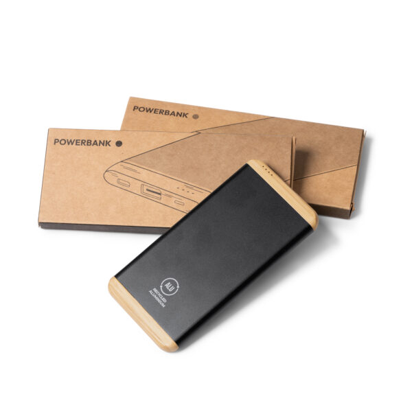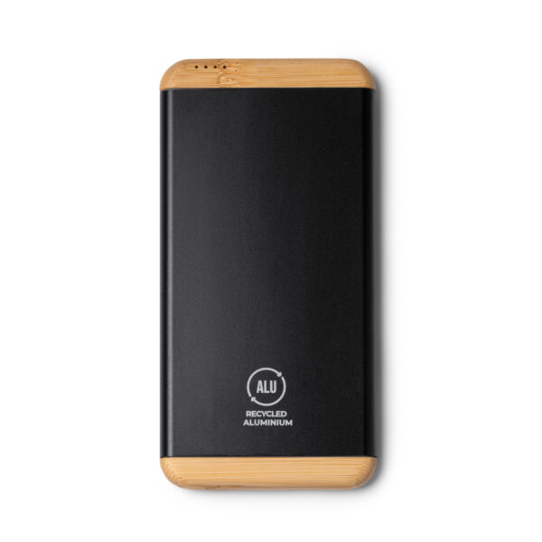 Batería externa de 5.000 mAh elaborada en cuerpo de aluminio reciclado y detalles en bambú. Puerto de entrada Tipo C y puerto de salida USB. Cuenta con indicador luminoso de carga.