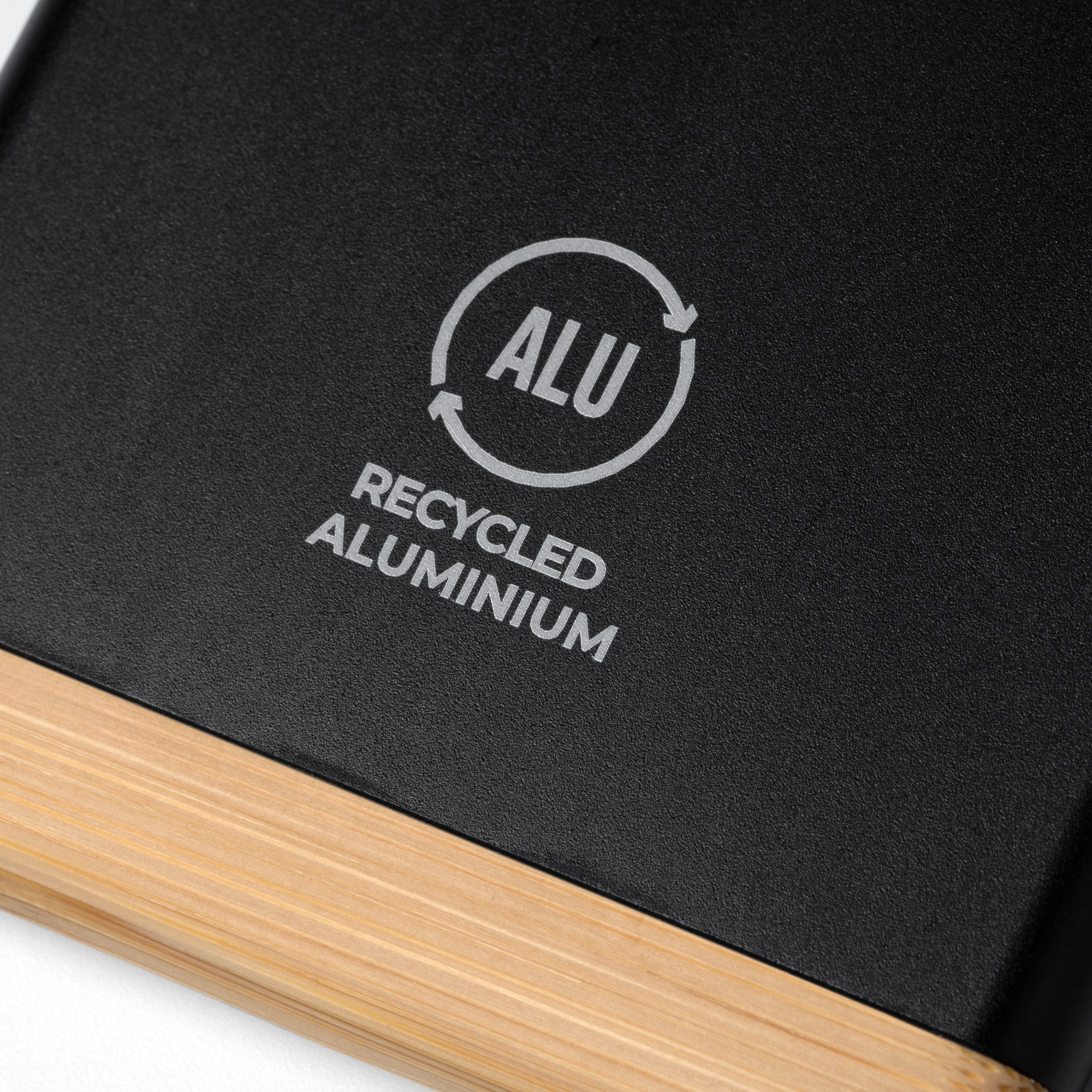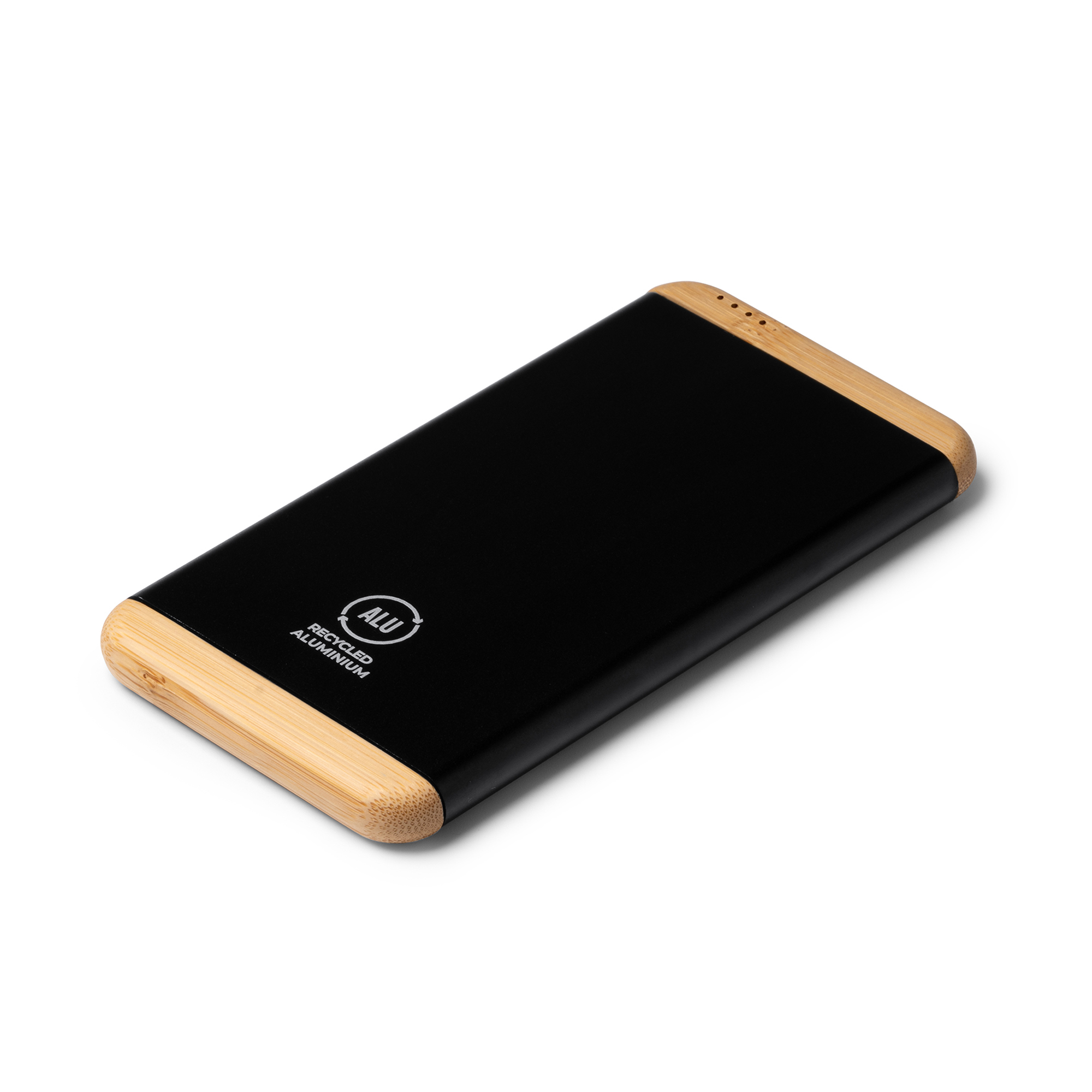 Batería externa de 5.000 mAh elaborada en cuerpo de aluminio reciclado y detalles en bambú. Puerto de entrada Tipo C y puerto de salida USB. Cuenta con indicador luminoso de carga.