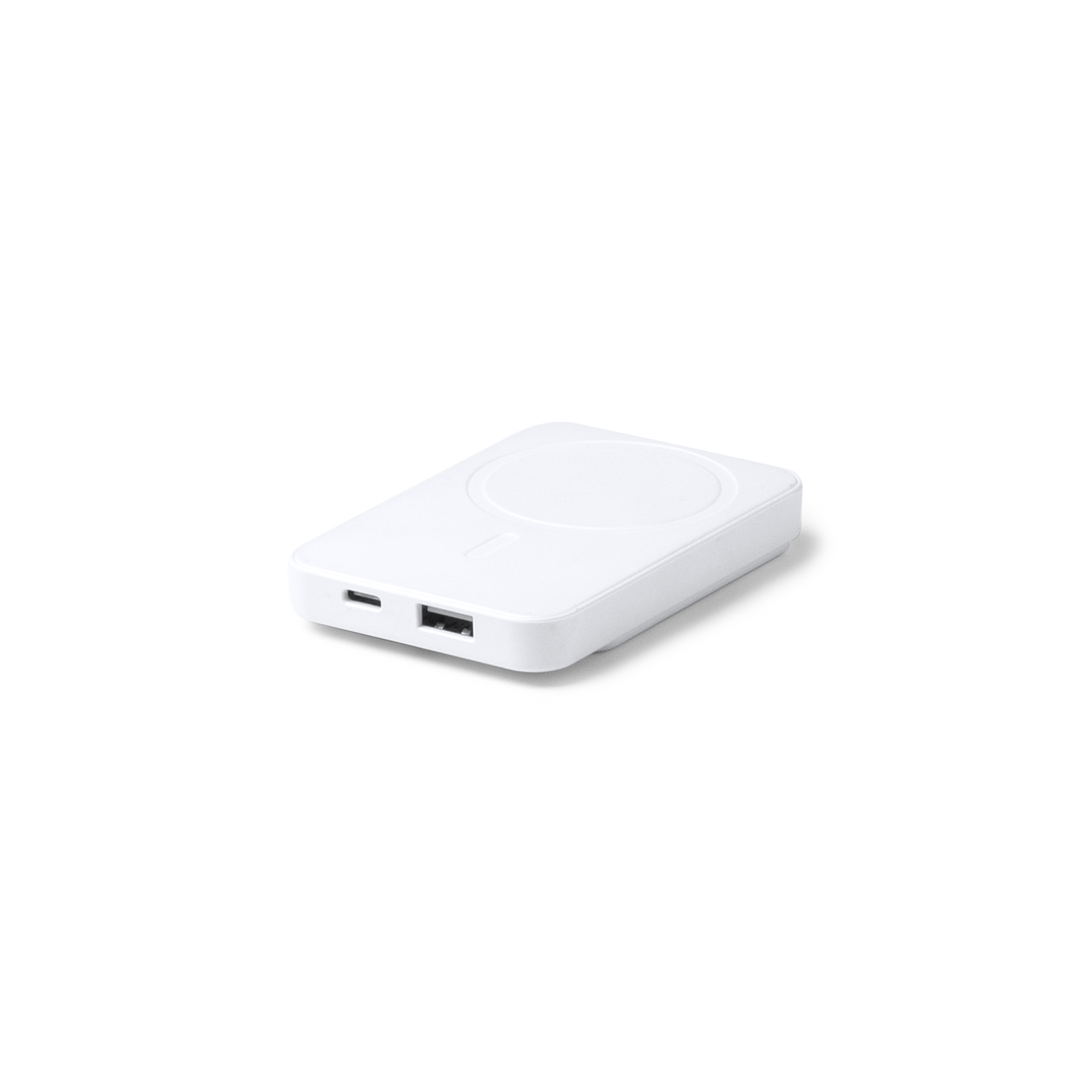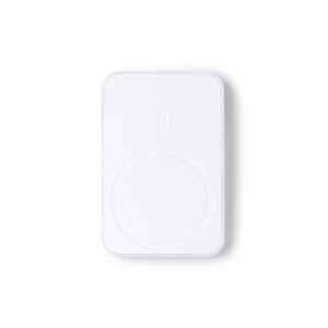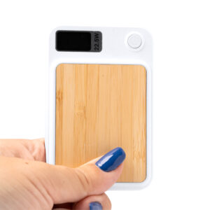 Batería externa realizada con cuerpo de bambú y ABS reciclado y capacidad de 5000mAh. Con función de carga magnética de 15W, compatible con dispositivos provistos de esta tecnología, y pantalla led que indica el porcentaje de batería. Puerto Tipo C de entrada y salida y puerto USB de salida. Incluye anillo accesorio adhesivo.