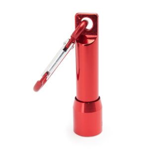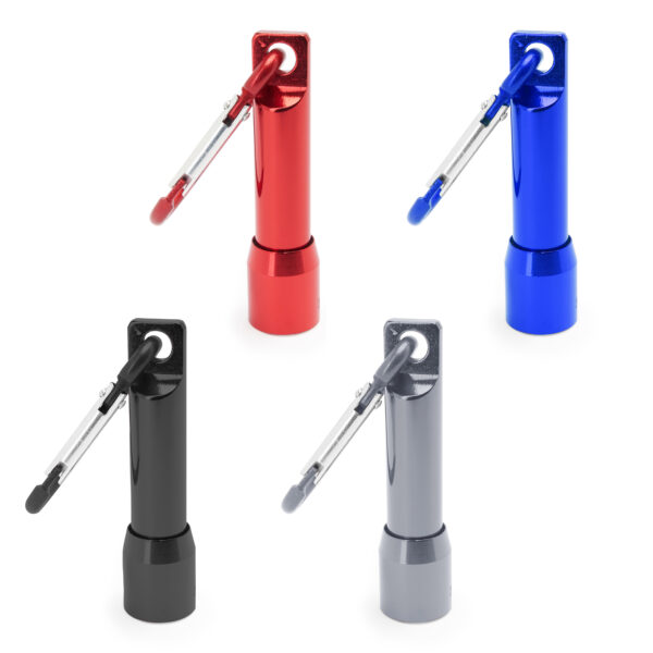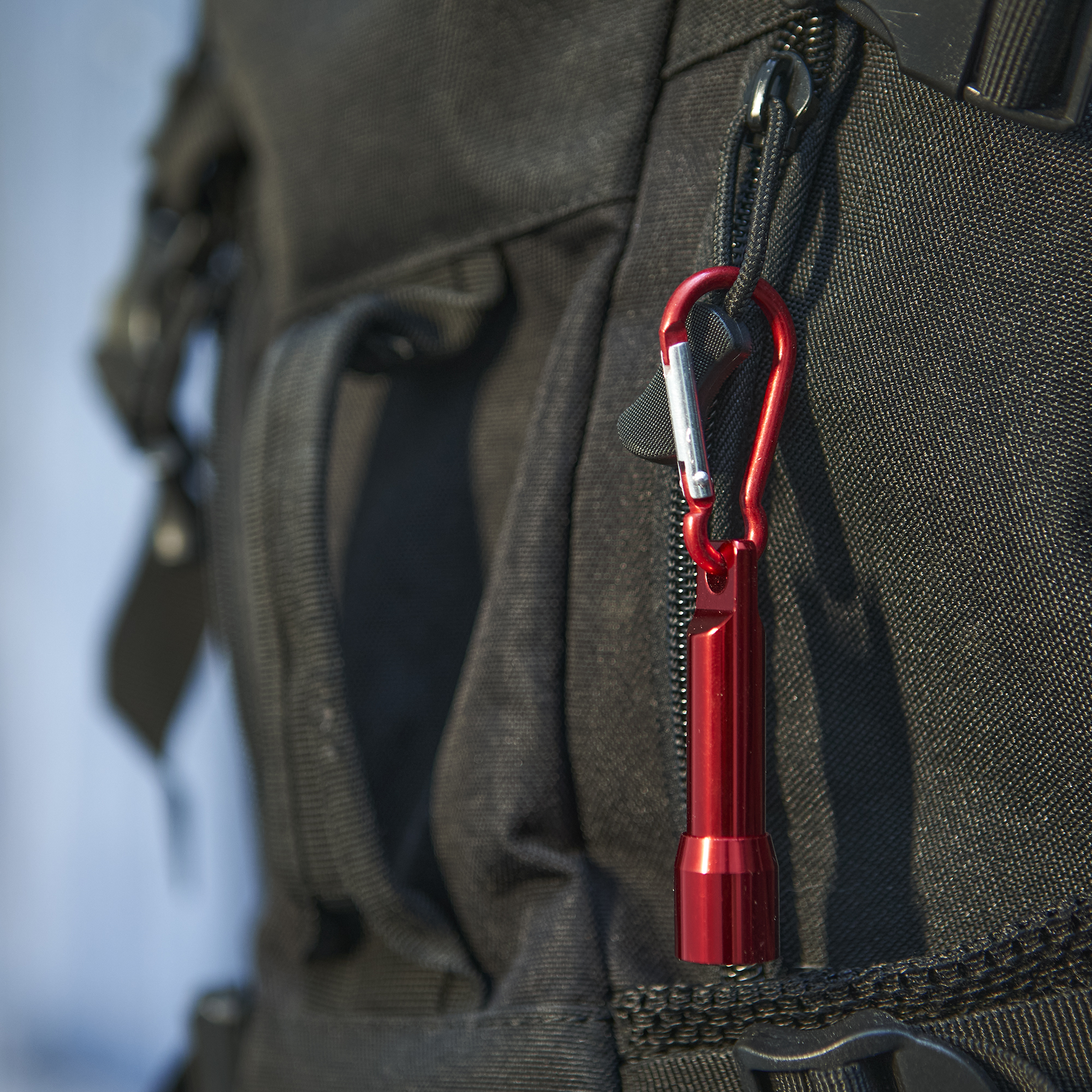 Linterna con 1 luz LED a pilas. Disponible en varios colores metalizados con mosquetón de transporte a juego. Composición: Aluminio Observaciones: Pilas de botón incluidas. Mosquetón no apto para escalada.